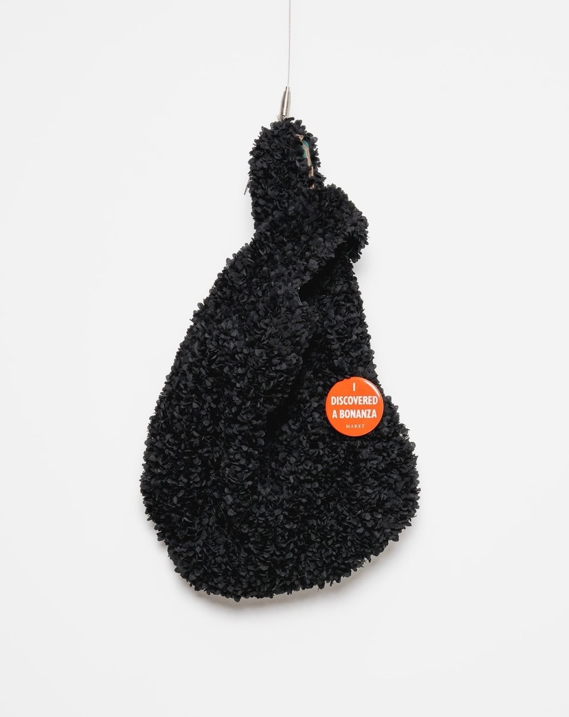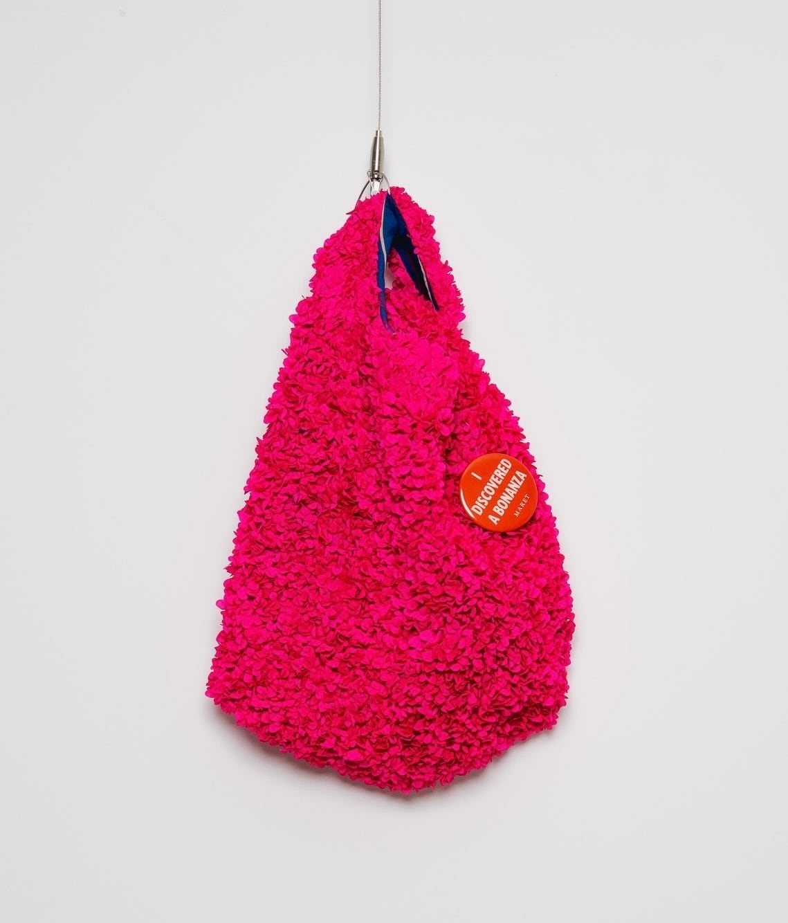 フリフリとした素材が楽しいバック。ミスマッチな『思いがけない幸運を発見!』と言う意味のバッジ付き。シンプルな装いやカジュアルな時のポイントに。ちらっと覗く裏地のストライプもいい差し色です。