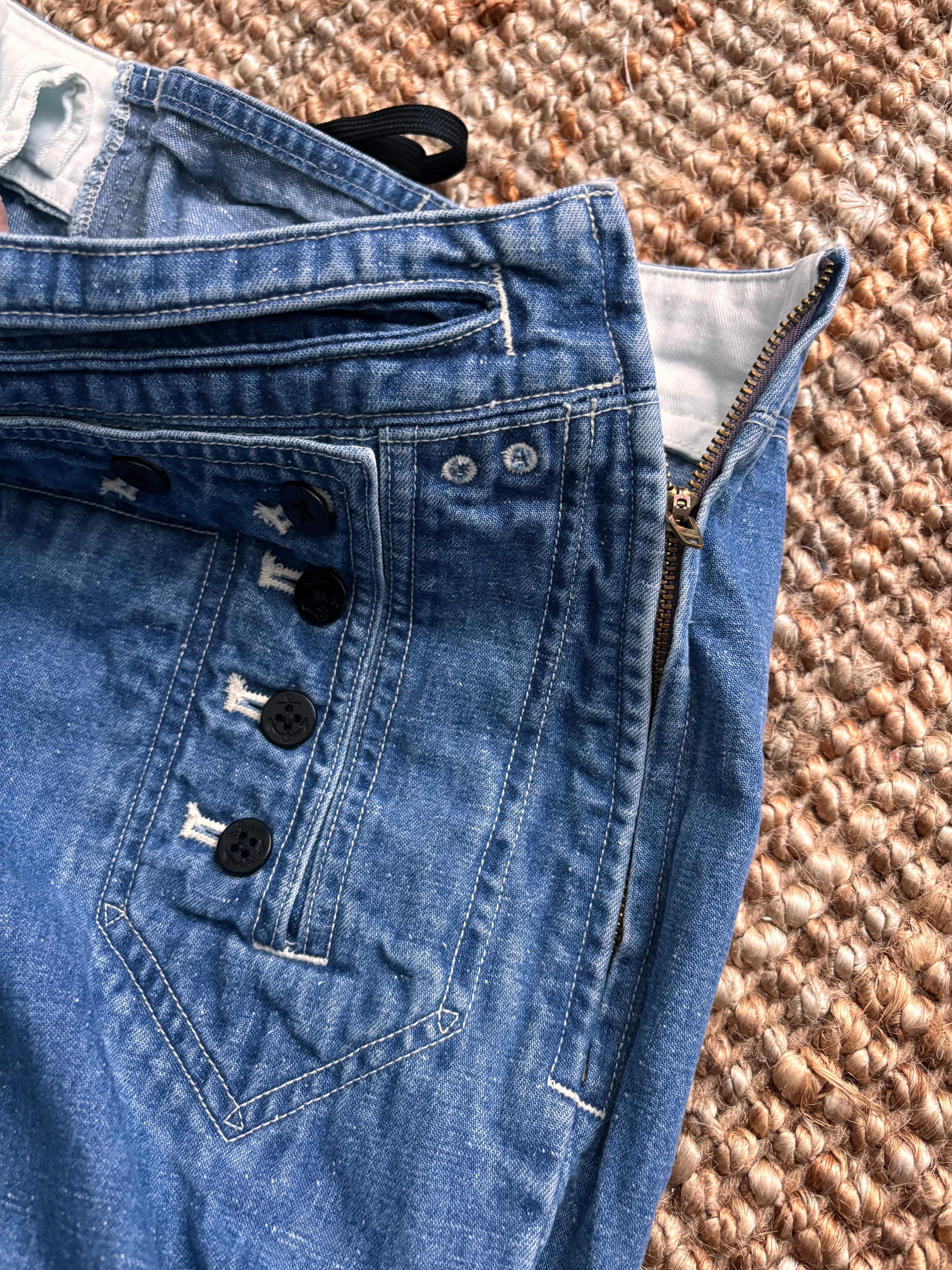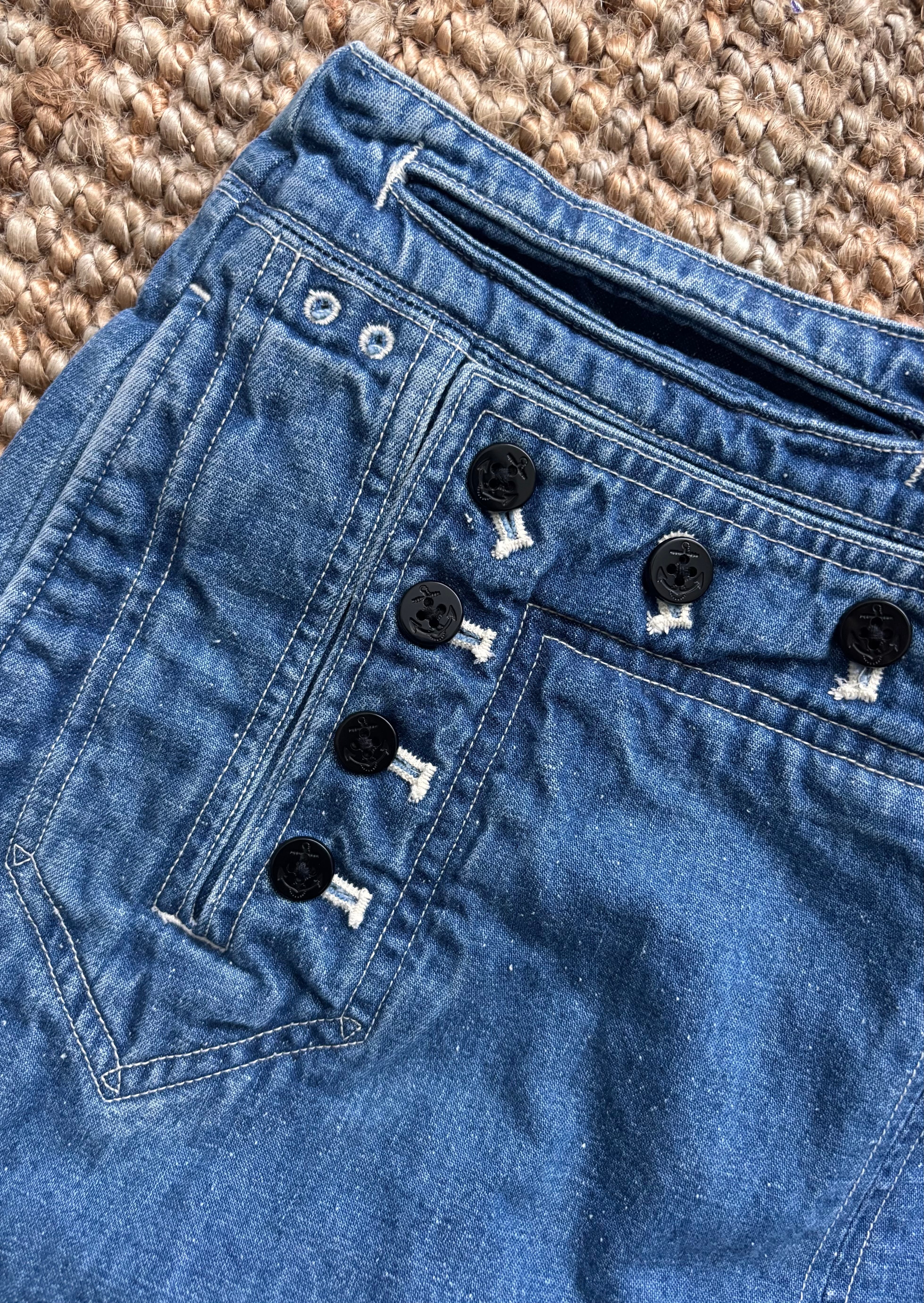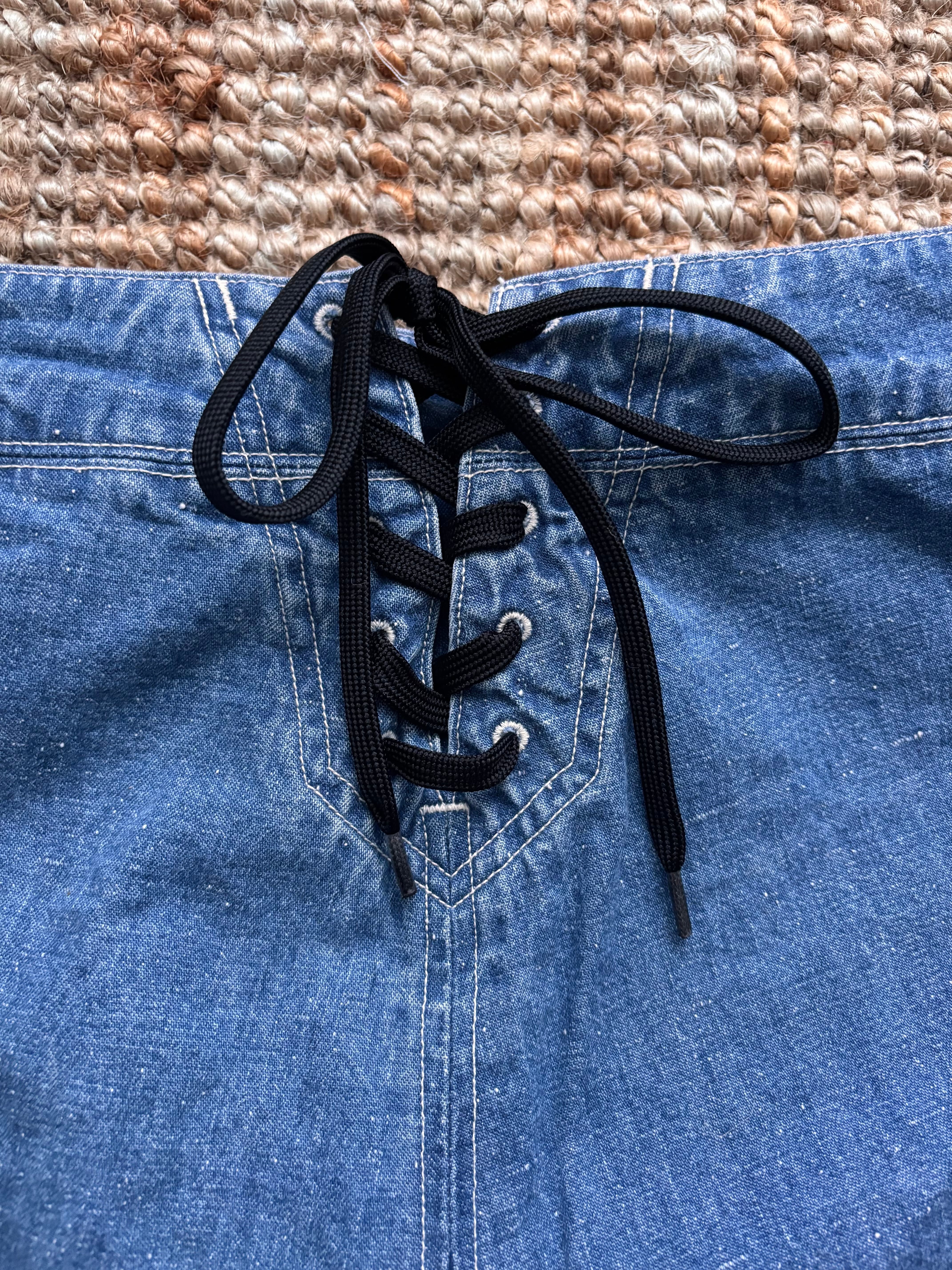 オールシーズン着用可能なインディゴのライトライトオンスデニムを使用。世界的に有名なデニムの産地 岡山産。横糸に大きなネップ糸を織り込み表情が豊か。USNAVYのセーラーパンツをオマージュ。後ろのレースアップ部分でサイズ調節ができます。サイドファスナーなので着脱も楽々です。