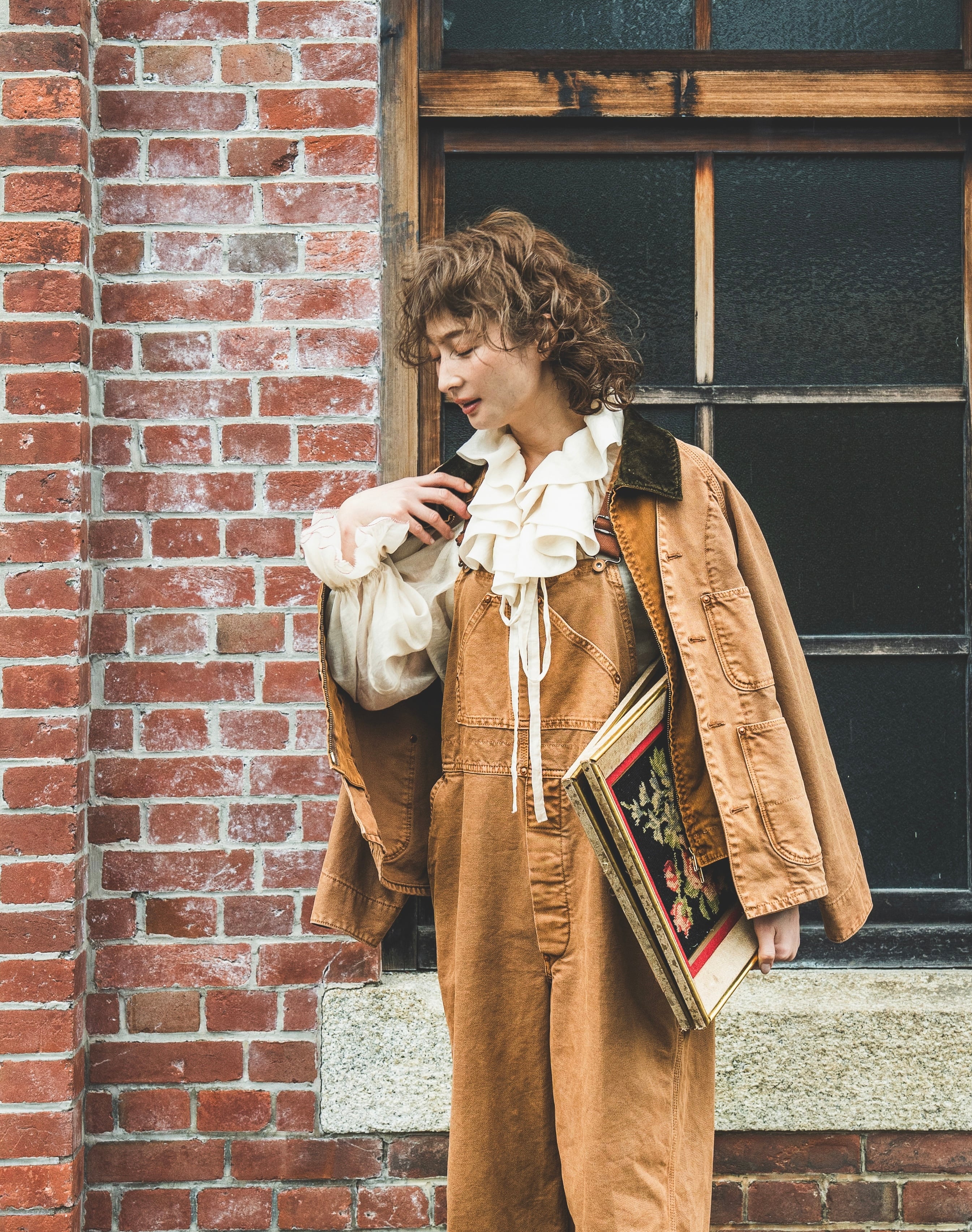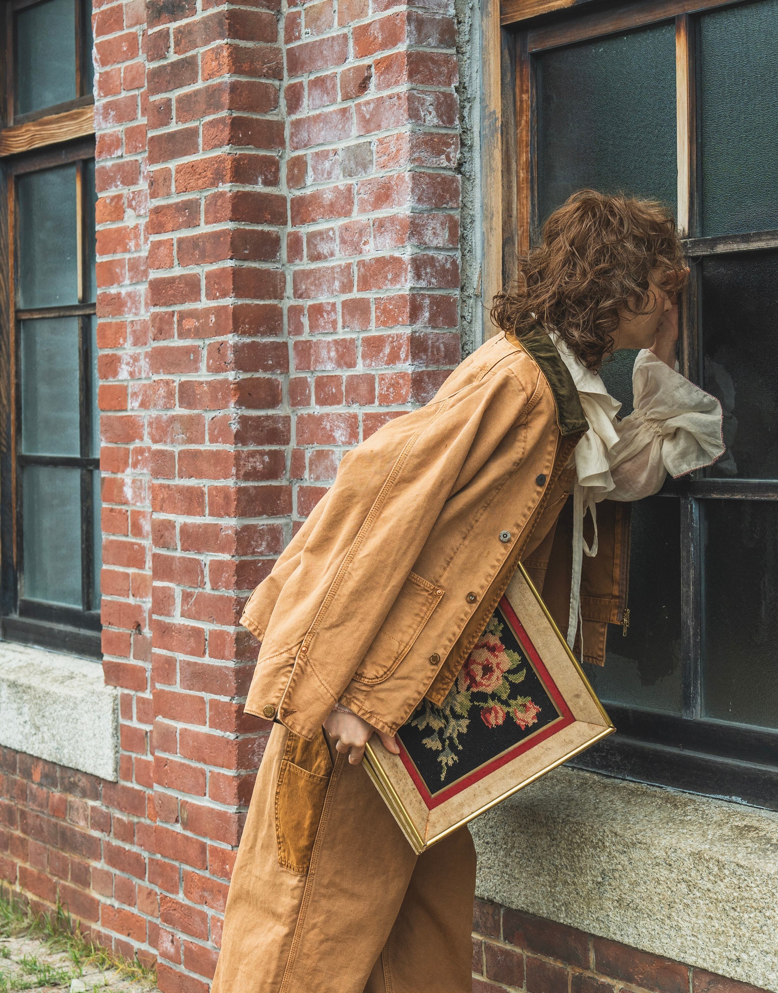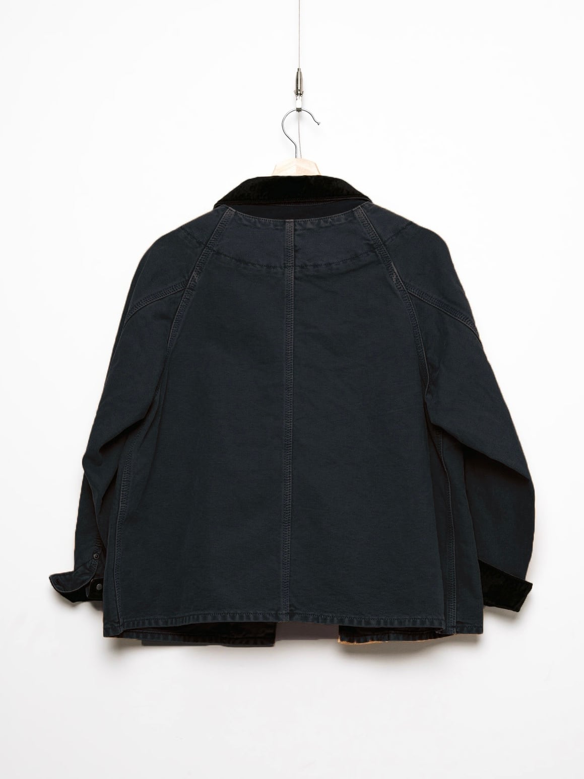 ガシッと硬そうなイメージのワークダックをオーガニックコットンを使う事で柔らかく着やすく。ワークイメージだけど反するエレガントさを出したくて襟をレーヨンのベルベット素材にしました。裾にかけてのテントラインは男女問わず着ていただけてキャワイイです。ピグメント加工でクリアなあたり感を出しています。
