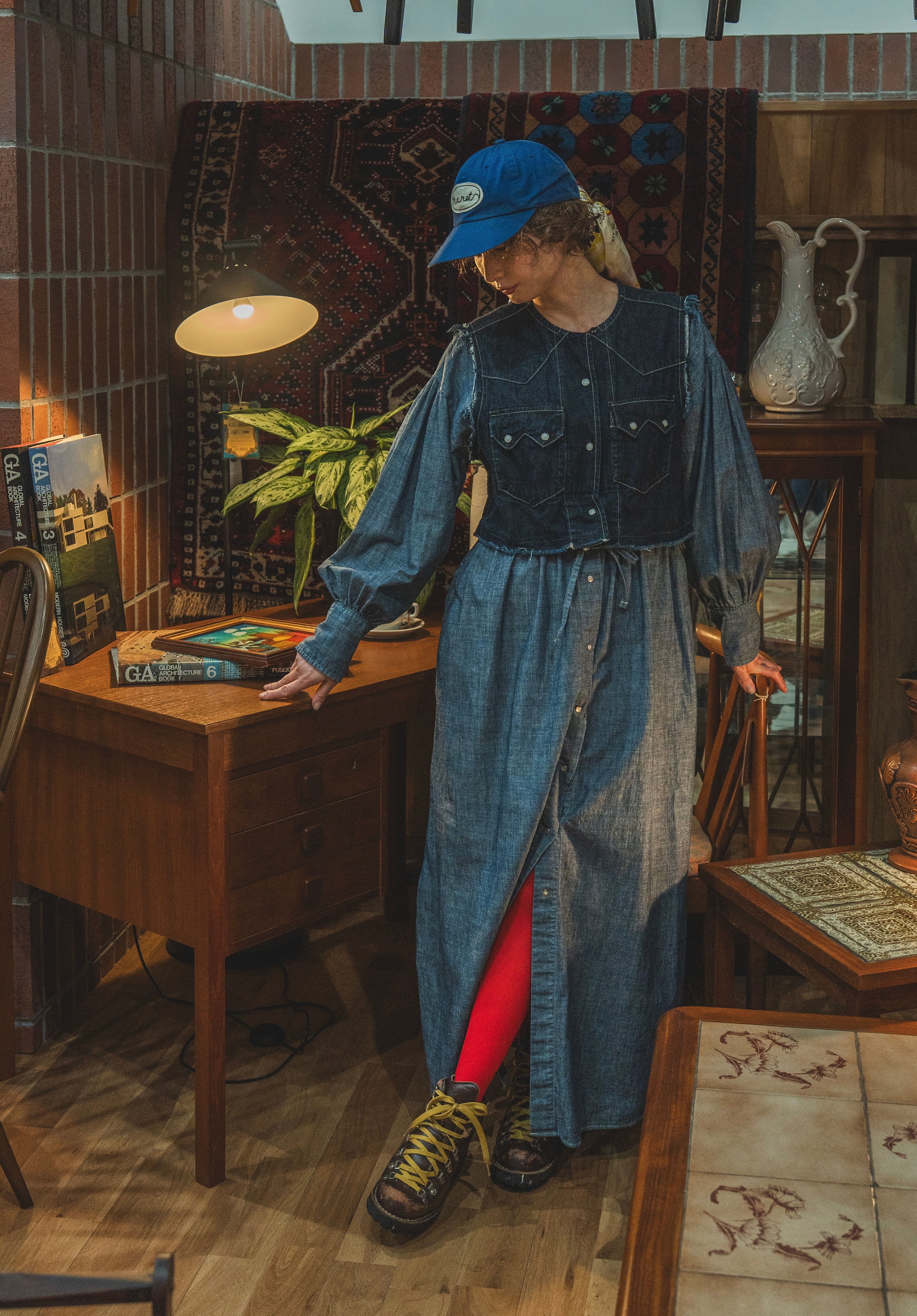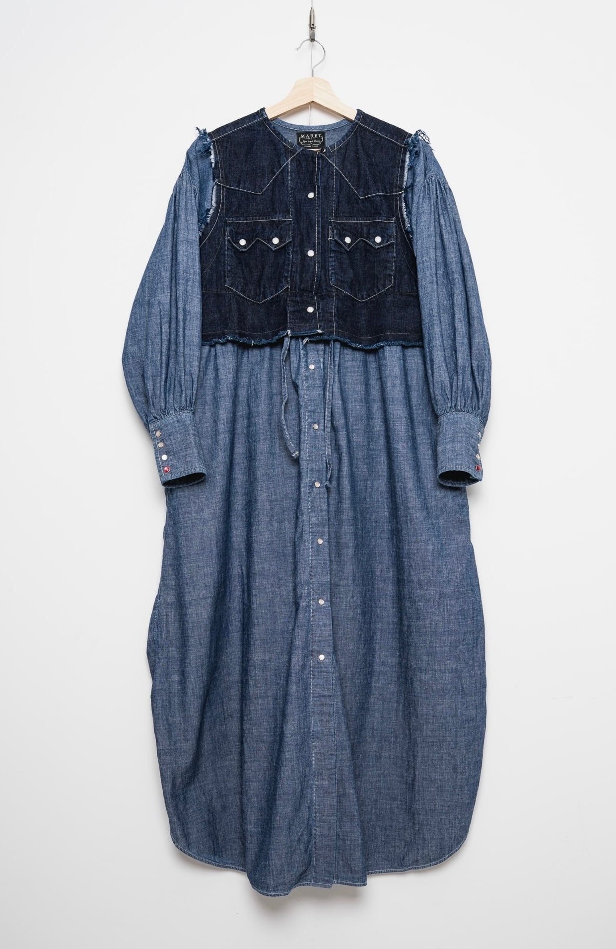 デニムのウエスタンシャツとインディゴダンガリーのウエスタンディティールのワンピースをドッキング。0サイズは1サイズから丈の差のみでサイズ展開。