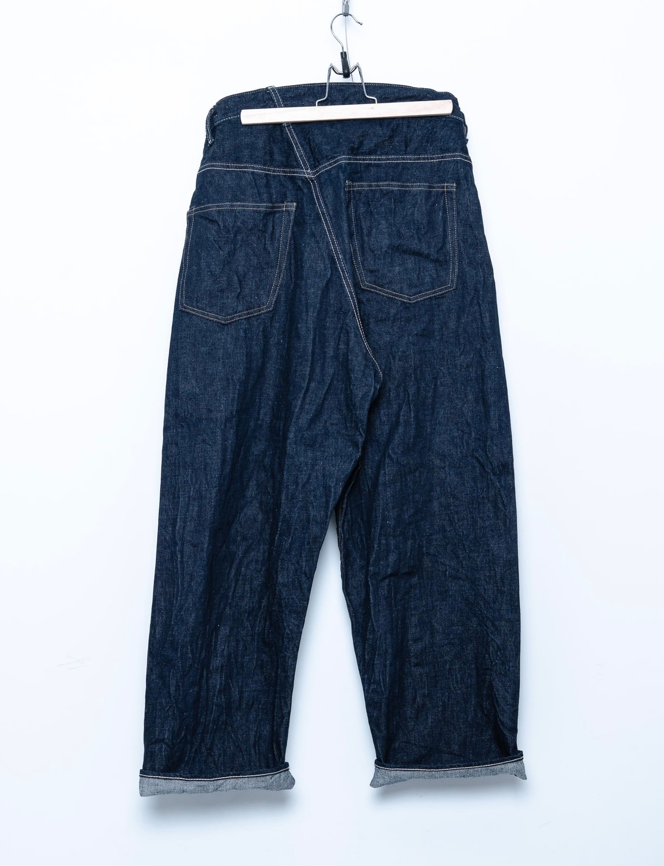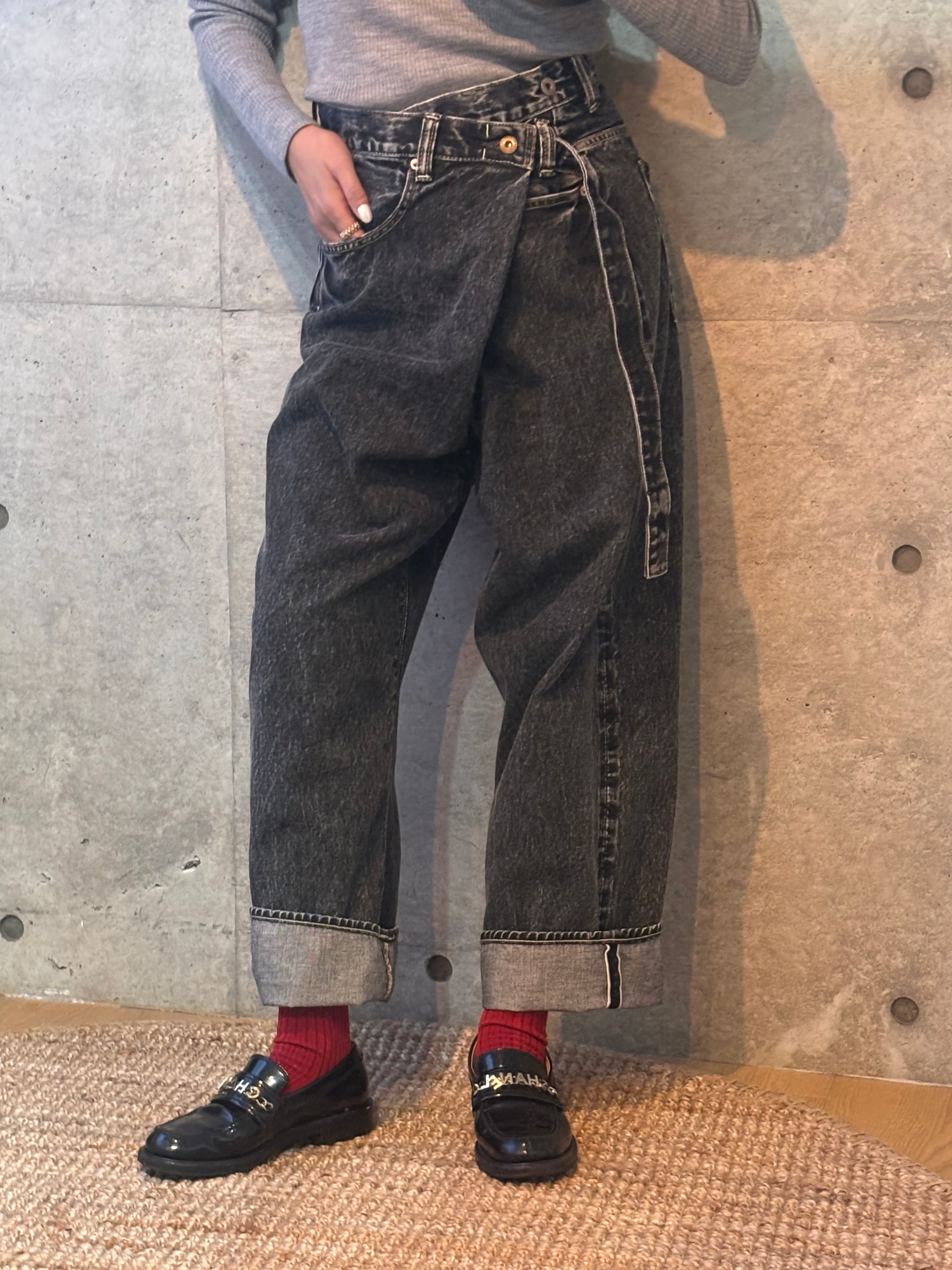 岡山産のオーガニックコットンのセルビッチデニムを使用。サイズの大きなパンツをサイドに大きくタックを取ってアシンメトリーなシルエットで履いたようなデザイン。名付けてアシタックパンツ。セルビッチを使用し、ゆったりシルエットに。